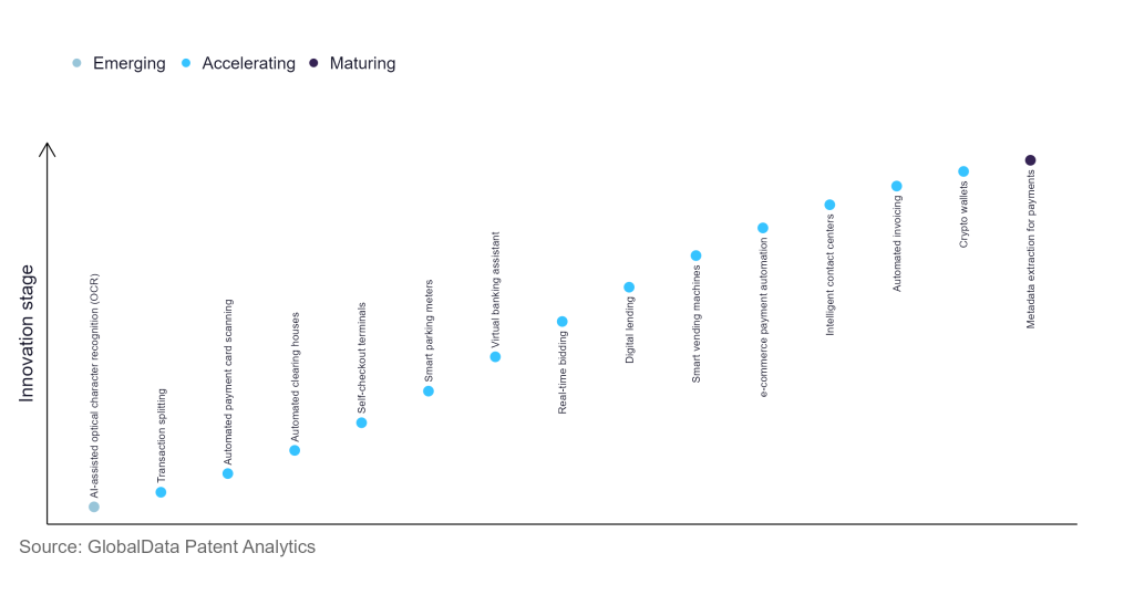 Within the emerging innovation stage, AI-assisted OCR is a disruptive technology that is in the early stage of application and should be tracked closely. Transaction splitting, automated payment card scanning, and automated clearing houses are some of the accelerating innovation areas, where adoption has been steadily increasing. Among maturing innovation areas is the metadata extraction for payments, which is now well established in the industry.