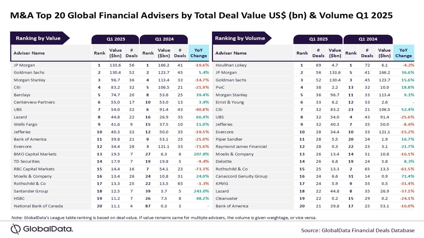 JP Morgan and Houlihan Lokey have been identified as the leading financial advisers in mergers and acquisitions (M&A) for the first quarter of 2025, according to the latest financial advisers league table published by GlobalData.