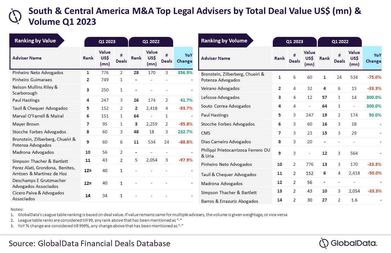 GlobalData, a leading data and analytics company, has revealed its league tables for top ten legal advisers by value and volume in South and Central America for Q1 2023.