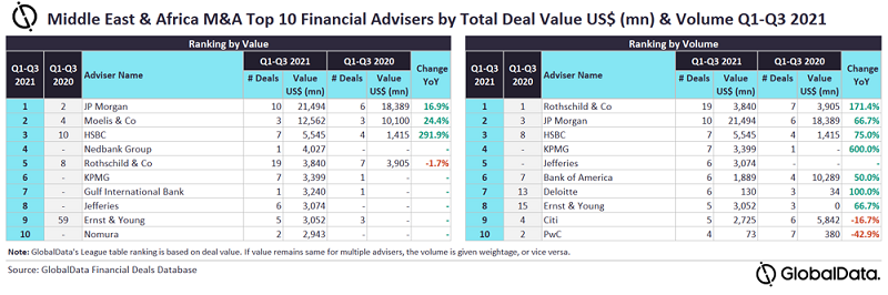 JP Morgan and Rothschild & Co were the top mergers and acquisition (M&A) financial advisers in the Middle East & Africa region for Q1-Q3 2021 by value and volume, respectively.