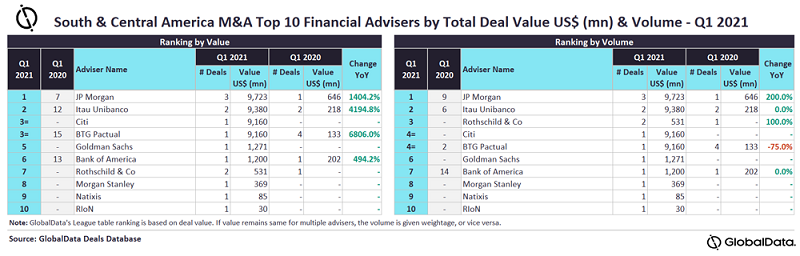 JP Morgan emerged as the top mergers and acquisitions (M&A) financial adviser in South & Central America for Q1 2021 in terms of value and volume. The firm advised on three deals worth $9.7bn, which was the highest value among all the advisers.