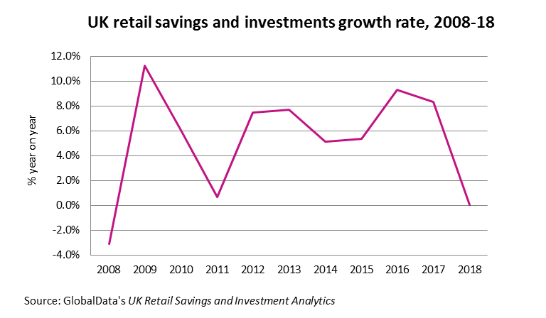 For the UK savings and investment market, 2018 was the worst year since the 2008 financial crash. The only year close was 2011, when the UK just escaped a double-dip recession. GlobalData’s UK Retail Savings and Investment Analytics estimates that the growth of retail assets was flat in 2018 compared to 2017 at exactly 0.02%. Although deposit balances were up 3%, this did not offset stock market losses. Stock markets globally closed 2018 on a bad note, and the UK was part of this crowd. As a result, UK retail direct equity and unit trust holdings decreased by -7% and -4% respectively.