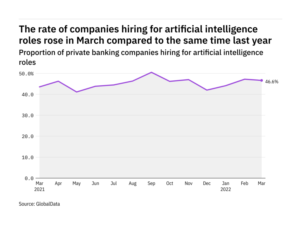 Artificial intelligence hiring levels in the private banking industry rose in March 2022