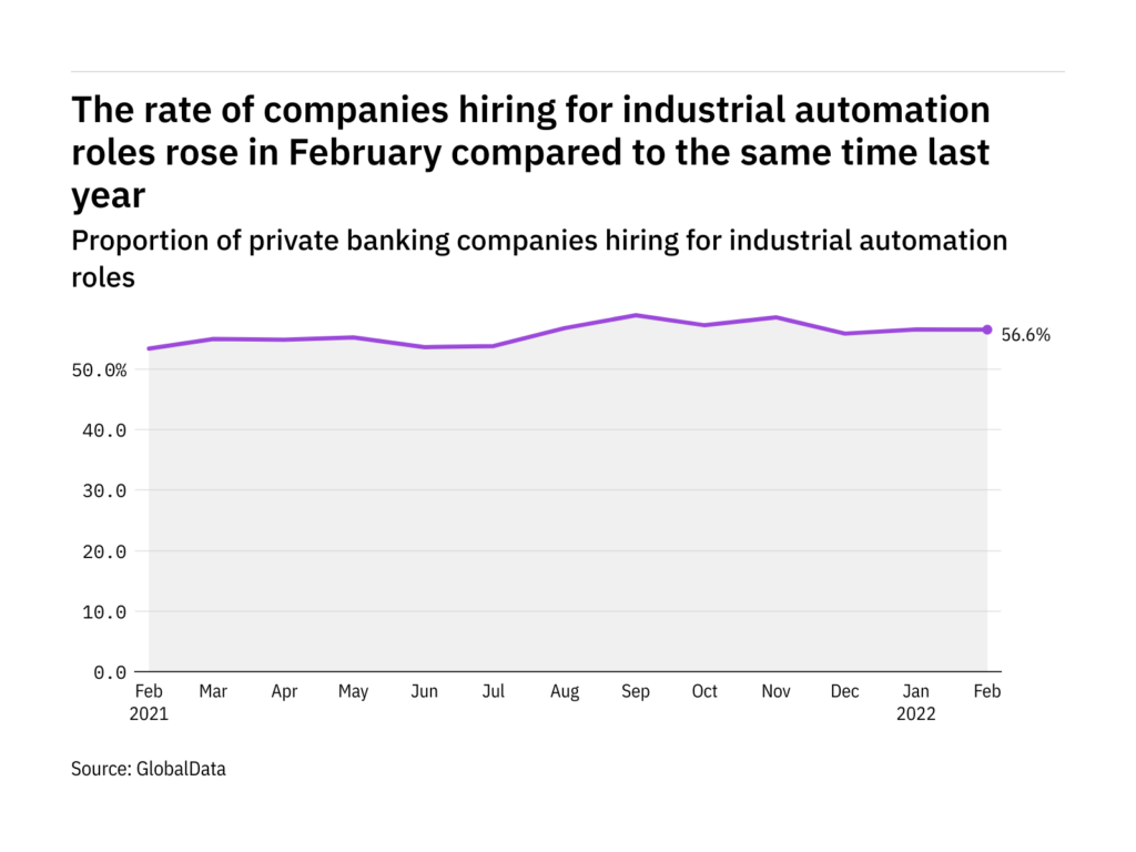Industrial automation hiring levels in the private banking industry rose in February 2022