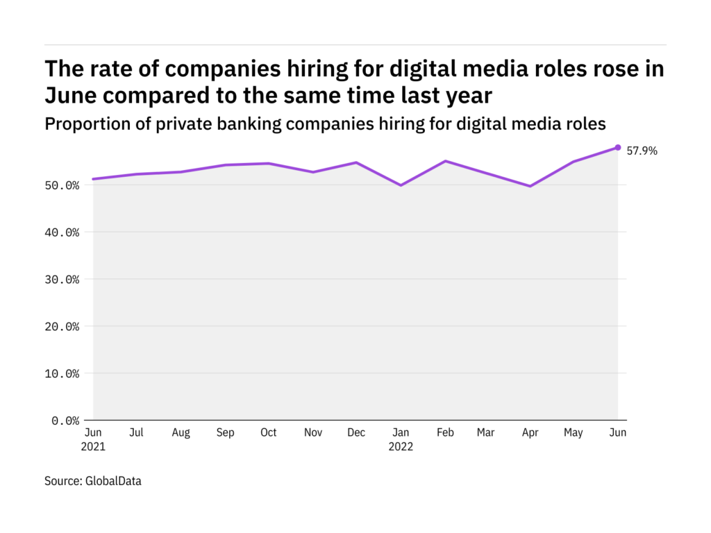 Digital media hiring levels in the private banking industry rose to a year-high in June 2022