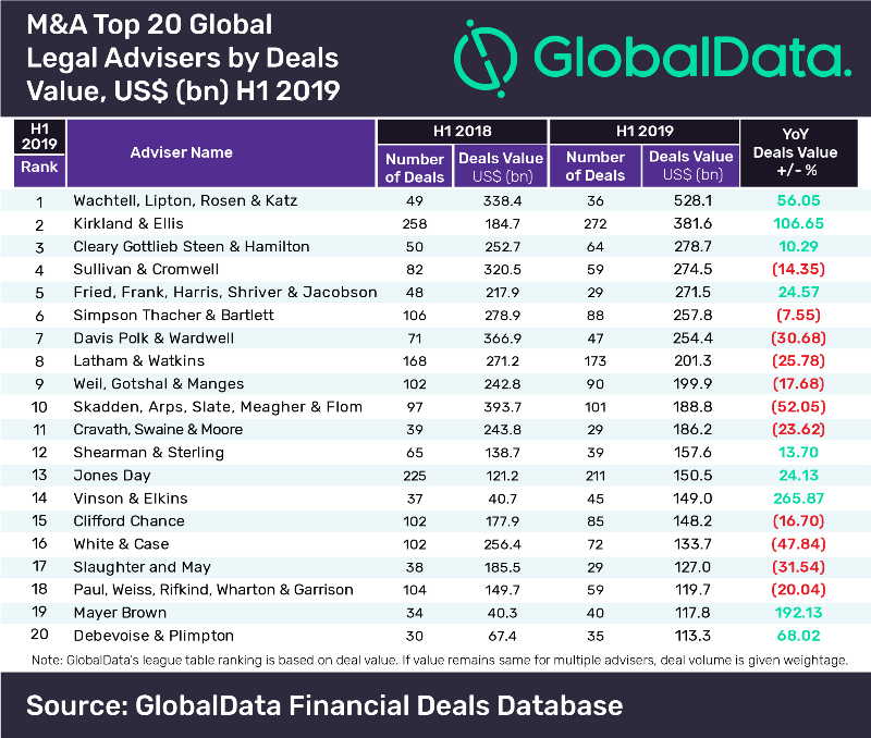 Wachtell, Lipton, Rosen & Katz leads global legal advisers league table for M&A deals in H1 2019