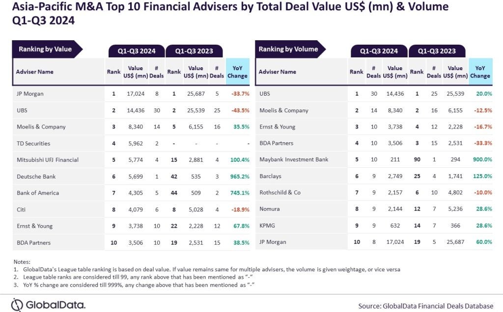 JP Morgan, UBS lead APAC M&A financial advisory rankings for Q1-Q3 2024