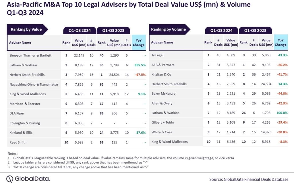 Simpson Thacher & Bartlett, TriLegal lead Q1-Q3 2024 APAC M&A legal advisory ranking