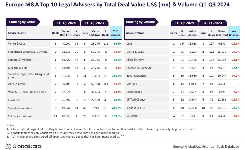 White & Case, CMS lead Europe M&A legal advisory rankings for Q1-Q3 2024