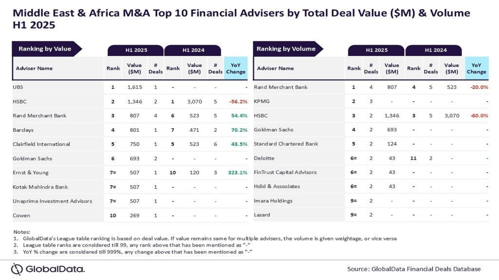 UBS, Rand Merchant Bank lead financial adviser M&A rankings in MEA for H1 2025