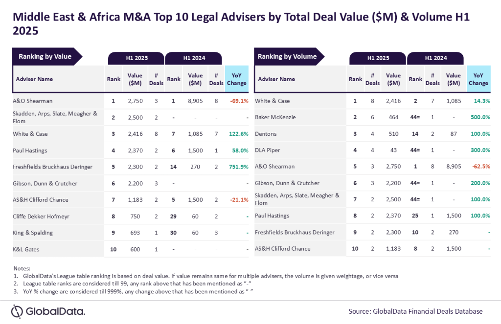 A&O Shearman and White & Case lead M&A legal advisory in Middle East & Africa in H1 2025