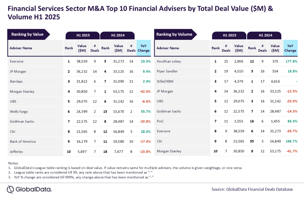 Evercore and Houlihan Lokey lead H1 2025 financial services M&A financial advisory rankings