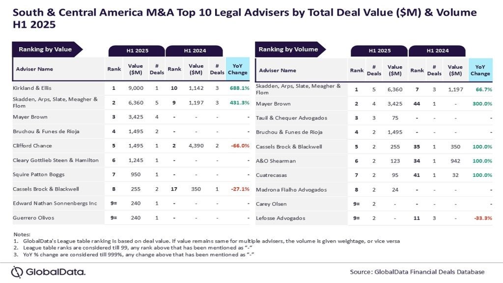 Kirkland & Ellis and Skadden lead M&A Legal Advisers table in South & Central America for H1 2025