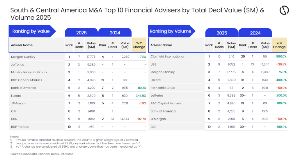 Morgan Stanley, Clairfield lead South & Central America M&A financial advisory in 2025
