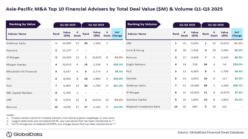 Goldman Sachs, UBS emerge top Asia-Pacific M&A financial advisers during Q1-Q3 2025