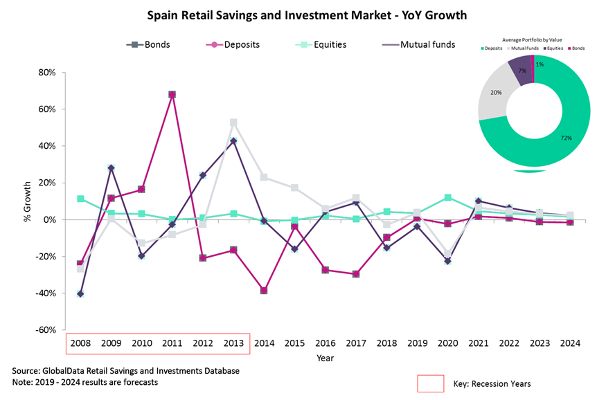 According to our Retail Investments Analytics, we estimate that the Spanish retail savings and investment market will grow by 1% in 2020. Just under 75% of the average investor portfolio is in safe-haven products, mostly deposits, and only 1% in bonds. Deposits will be the only asset class that grows in 2020, with an expected gain of 12%. Despite returns for savers being low, this is still better than holding wealth in riskier asset classes.