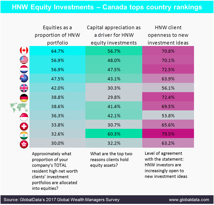 According to GlobalData’s 2017 Global Wealth Managers Survey, 38.6% of the typical HNW investor portfolio is held in equities, followed by fixed income investments at 24.9%.