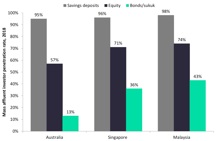 Despite bonds from blue-chip companies often being described as only one step away from term deposits, bond holding in all these countries remains limited. The gap between bond holding and shareholding among Australian mass affluent investors remains 44 percentage points (pp) in 2018, while it is 31pp in Singapore.