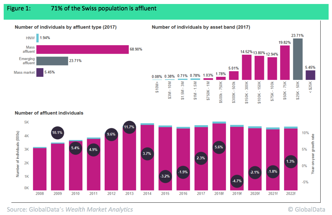 GlobalData’s Wealth in Switzerland: Sizing the Market report found that Swiss HNWIs accounted for 2% of the total population in 2017, while mass affluent individuals – those with between $50,000 and $1m in onshore liquid assets – account for an astonishing 69%.