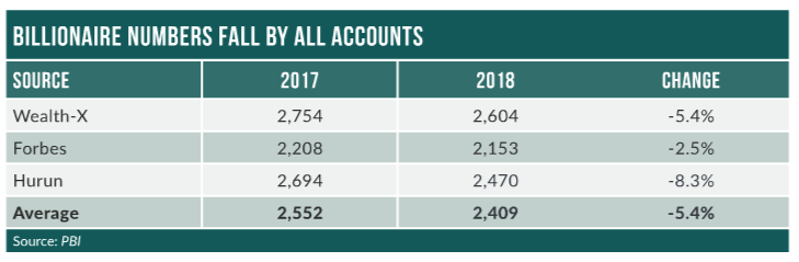 Market volatility, global trade tensions and economic slowdown were to blame for the slowdown according to Wealth-X which reckons billionaire wealth declined 7% to $8.6 trillion in 2018 with the number of billionaires dropping 5.4% to 2,604.