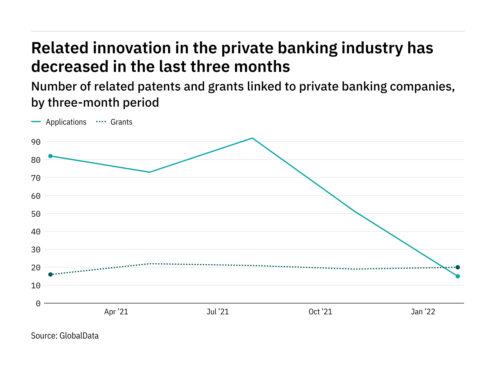 The most recent figures show that the number of related patent applications in the industry stood at 15 in the three months ending February – down from 82 over the same period in 2021.