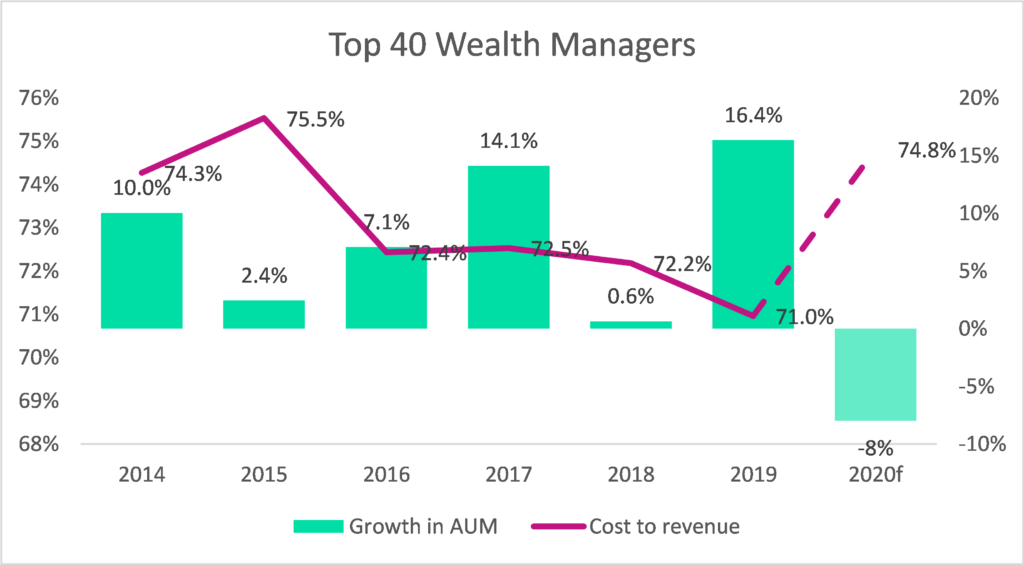 The leading wealth managers around the world entered 2020 in a relatively strong position with a stellar year for client assets, driven both by a buoyant market and positive client inflows. The cost-to-revenue ratio also improved after a couple of stagnant years, driven mostly by higher revenues significantly outpacing growth in costs. However, this will all go into reverse in 2020.
