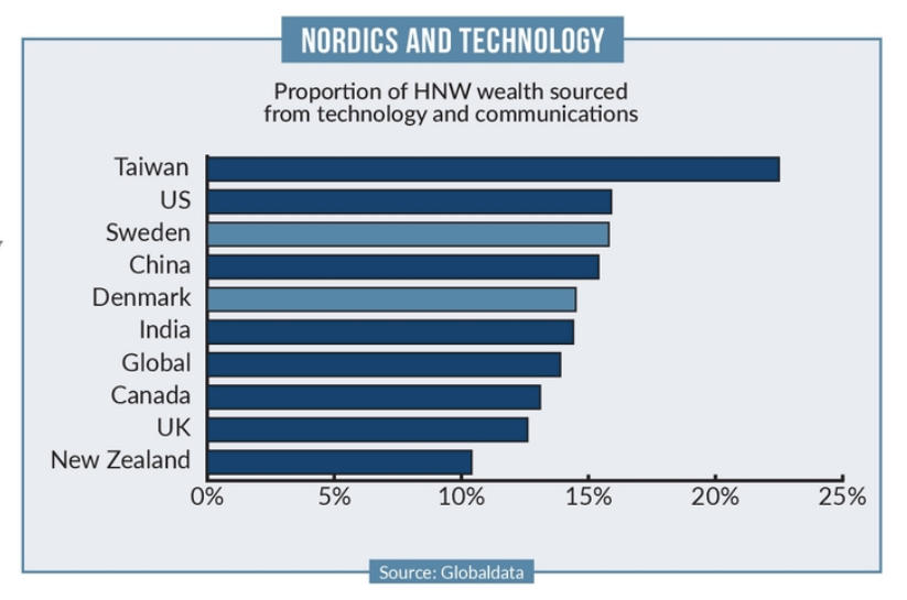 According to GlobalData, 15.8% of HNWIs in Sweden owe their wealth to technology and telecommunications, one of the highest proportions in the world.