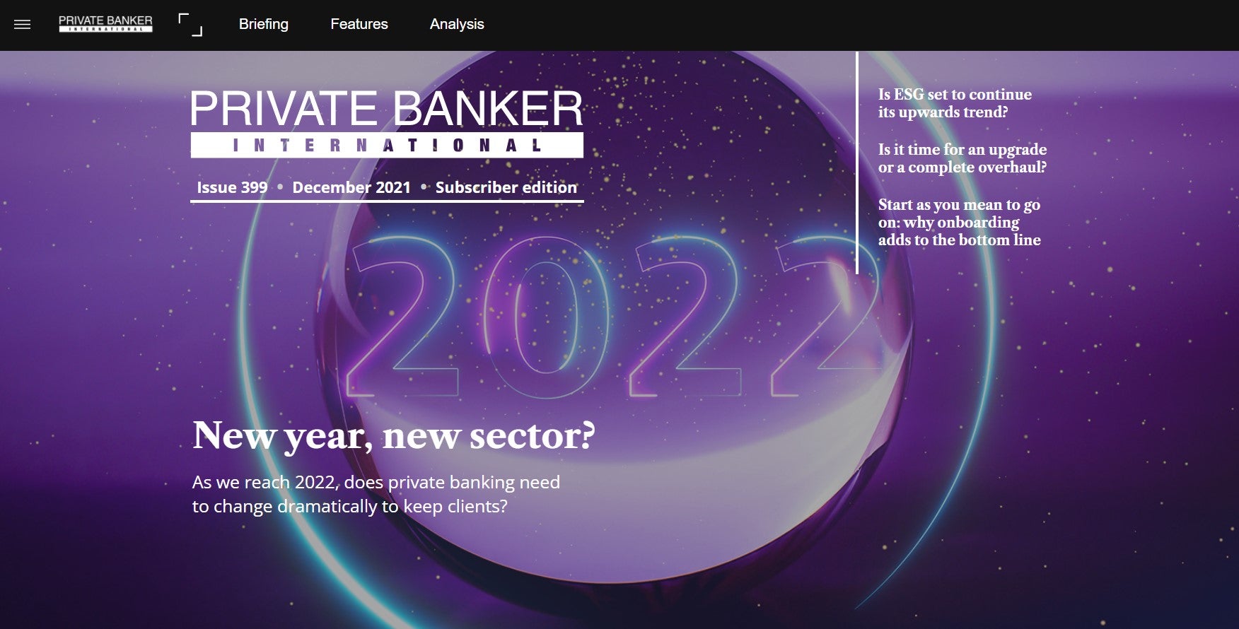 PBI 399, December 2021 Ravi Tangirala December 6, 2021 Share Copy Link Share on X Share on Linkedin Share on Facebook Sign up for our daily news round-up! Give your business an edge with our leading industry insights. Sign up Go deeper with GlobalData Reports FinTrack: February 2019 Reports FinTrack: January 2019 Go deeper with GlobalData The gold standard of business intelligence. Find out more Access deeper industry intelligence Experience unmatched clarity with a single platform that combines unique data, AI, and human expertise. Find out more Sign up for our daily news round-up! Give your business an edge with our leading industry insights. Give your business an edge with our leading industry insights. close close Sign up to the newsletter: In Brief Industry * Academia & Education Aerospace, Defense & Security Agriculture Asset Management Automotive Banking & Payments Chemicals Construction Consumer Foodservice Government, trade bodies and NGOs Health & Fitness Hospitals & Healthcare HR, Staffing & Recruitment Insurance Investment Banking Legal Services Management Consulting Marketing & Advertising Media & Publishing Medical Devices Mining Oil & Gas Packaging Pharmaceuticals Power & Utilities Private Equity Real Estate Retail Sport Technology Telecom Transportation & Logistics Travel, Tourism & Hospitality Venture Capital Country * UK USA Afghanistan Åland Islands Albania Algeria American Samoa Andorra Angola Anguilla Antarctica Antigua and Barbuda Argentina Armenia Aruba Australia Austria Azerbaijan Bahamas Bahrain Bangladesh Barbados Belarus Belgium Belize Benin Bermuda Bhutan Bolivia Bonaire, Sint Eustatius and Saba Bosnia and Herzegovina Botswana Bouvet Island Brazil British Indian Ocean Territory Brunei Darussalam Bulgaria Burkina Faso Burundi Cambodia Cameroon Canada Cape Verde Cayman Islands Central African Republic Chad Chile China Christmas Island Cocos Islands Colombia Comoros Congo Democratic Republic of the Congo Cook Islands Costa Rica Côte d"Ivoire Croatia Cuba Curaçao Cyprus Czech Republic Denmark Djibouti Dominica Dominican Republic Ecuador Egypt El Salvador Equatorial Guinea Eritrea Estonia Ethiopia Falkland Islands Faroe Islands Fiji Finland France French Guiana French Polynesia French Southern Territories Gabon Gambia Georgia Germany Ghana Gibraltar Greece Greenland Grenada Guadeloupe Guam Guatemala Guernsey Guinea Guinea-Bissau Guyana Haiti Heard Island and McDonald Islands Holy See Honduras Hong Kong Hungary Iceland India Indonesia Iran Iraq Ireland Isle of Man Israel Italy Jamaica Japan Jersey Jordan Kazakhstan Kenya Kiribati North Korea South Korea Kuwait Kyrgyzstan Lao Latvia Lebanon Lesotho Liberia Libyan Arab Jamahiriya Liechtenstein Lithuania Luxembourg Macao Macedonia, The Former Yugoslav Republic of Madagascar Malawi Malaysia Maldives Mali Malta Marshall Islands Martinique Mauritania Mauritius Mayotte Mexico Micronesia Moldova Monaco Mongolia Montenegro Montserrat Morocco Mozambique Myanmar Namibia Nauru Nepal Netherlands New Caledonia New Zealand Nicaragua Niger Nigeria Niue Norfolk Island Northern Mariana Islands Norway Oman Pakistan Palau Palestinian Territory Panama Papua New Guinea Paraguay Peru Philippines Pitcairn Poland Portugal Puerto Rico Qatar Réunion Romania Russian Federation Rwanda Saint Helena, Ascension and Tristan da Cunha Saint Kitts and Nevis Saint Lucia Saint Pierre and Miquelon Saint Vincent and The Grenadines Samoa San Marino Sao Tome and Principe Saudi Arabia Senegal Serbia Seychelles Sierra Leone Singapore Slovakia Slovenia Solomon Islands Somalia South Africa South Georgia and The South Sandwich Islands Spain Sri Lanka Sudan Suriname Svalbard and Jan Mayen Swaziland Sweden Switzerland Syrian Arab Republic Taiwan Tajikistan Tanzania Thailand Timor-Leste Togo Tokelau Tonga Trinidad and Tobago Tunisia Turkey Turkmenistan Turks and Caicos Islands Tuvalu Uganda Ukraine United Arab Emirates US Minor Outlying Islands Uruguay Uzbekistan Vanuatu Venezuela Vietnam British Virgin Islands US Virgin Islands Wallis and Futuna Western Sahara Yemen Zambia Zimbabwe Kosovo I would also like to subscribe to: Private Banker In Brief Private Banker International : Private Banker International Focus (monthly) Thematic Take (monthly) I consent to Verdict Media Limited collecting my details provided via this form in accordance with Privacy Policy Subscribe Visit our Privacy Policy for more information about our services, how we may use, process and share your personal data, including information of your rights in respect of your personal data and how you can unsubscribe from future marketing communications. Our services are intended for corporate subscribers and you warrant that the email address submitted is your corporate email address. Thank you for subscribing View all newsletters from across the GlobalData Media network. close