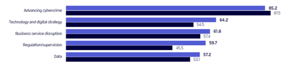 The Horizon survey, issued by ORX, the global operational risk association, indicated that cybercrime remained the top developing risk for the third consecutive year, followed by technology and digital strategy and business service disruption in third place.