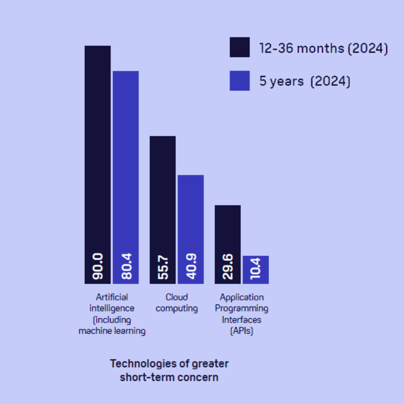 In an additional division, participants were requested to identify and prioritise the top five technologies that present the highest risk to their companies in the upcoming 12-36 months, and five years.