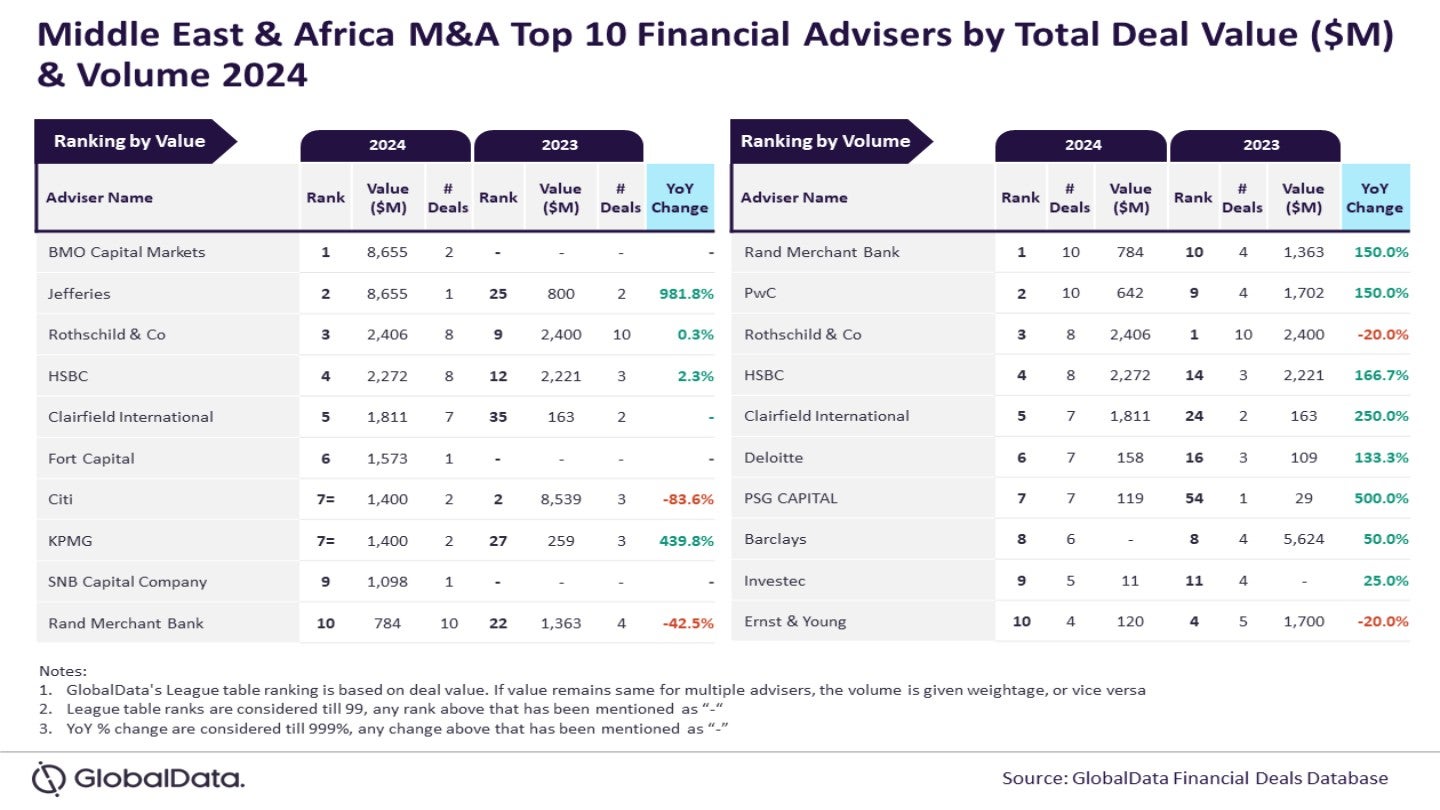 BMO Capital Markets and Rand Merchant Bank have emerged as the leading financial advisers in the Middle East and Africa (MEA) region in the financial services sector for mergers and acquisitions (M&A) in terms of value and volume, respectively, in 2024, according to the latest financial advisers league table by GlobalData.