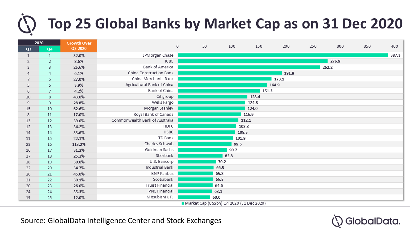 Top global banks ended the year 2020 on a high, with total market cap increasing by 25.4% from $2,597.1bn, as of 30 September 2020 (Q3 2020), to $3,258bn, as of 31 December 2020 (Q4 2020), says GlobalData, a data analytics and research company.