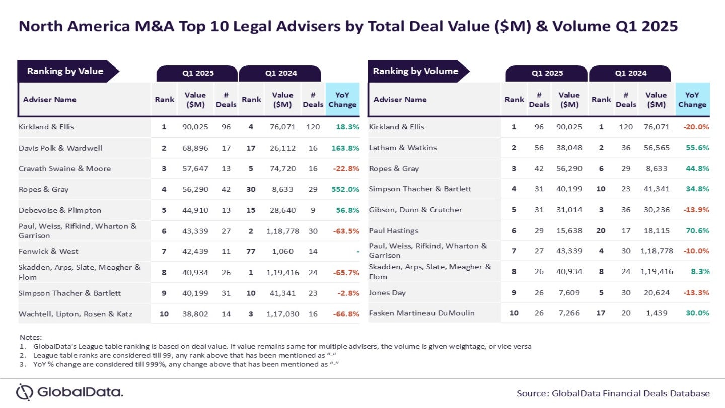Kirkland & Ellis has emerged as the foremost mergers and acquisitions (M&A) legal adviser in terms of value and volume in North America for the first quarter of 2025, according to GlobalData’s latest legal advisers league table.