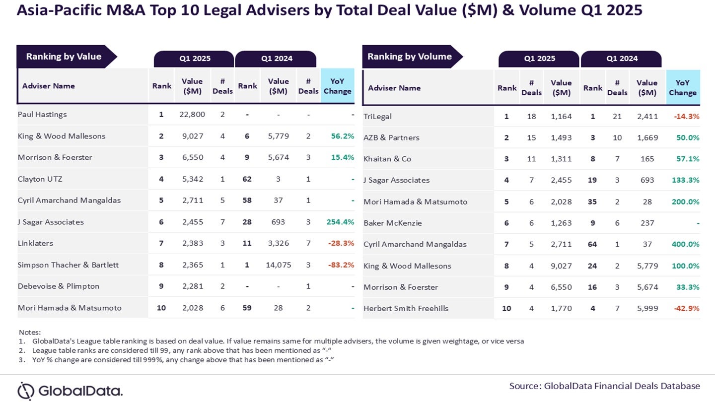 Paul Hastings and TriLegal have topped the mergers and acquisitions (M&A) legal advisers rankings for the first quarter of 2025 in the Asia-Pacific region, based on data from GlobalData’s latest legal advisers league table.