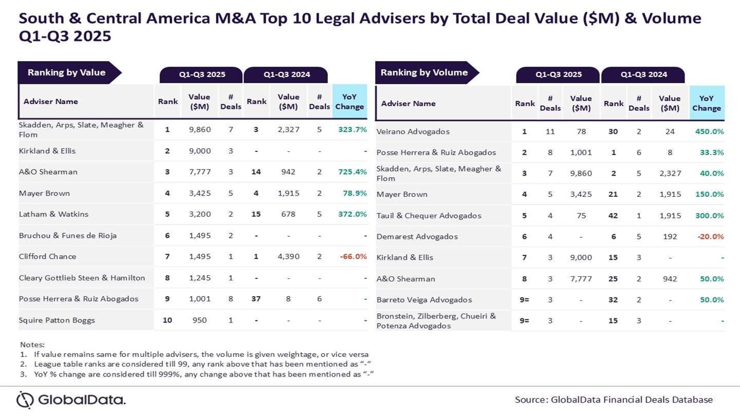 In the realm of mergers and acquisitions (M&A), Skadden, Arps, Slate, Meagher & Flom, and Veirano Advogados have emerged as the top legal advisers in the South & Central American region for the first three quarters (Q1-Q3)of 2025, according to GlobalData, a data and analytics firm.
