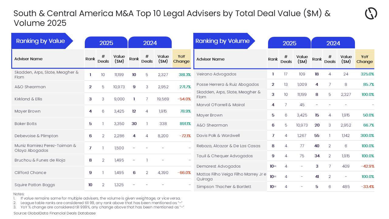 Skadden, Arps, Slate, Meagher & Flom and Veirano Advogados have been identified as leading legal advisers for mergers and acquisitions in South & Central America in 2025, based on data published by GlobalData.
