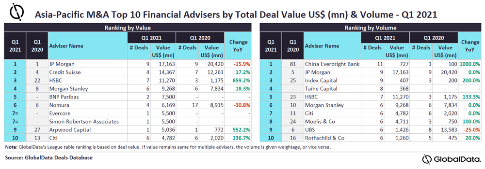 JP Morgan and China Everbright Bank were the top mergers and acquisitions (M&A) financial advisers in the Asia-Pacific (APAC) region for Q1 2021 by value and volume, respectively.