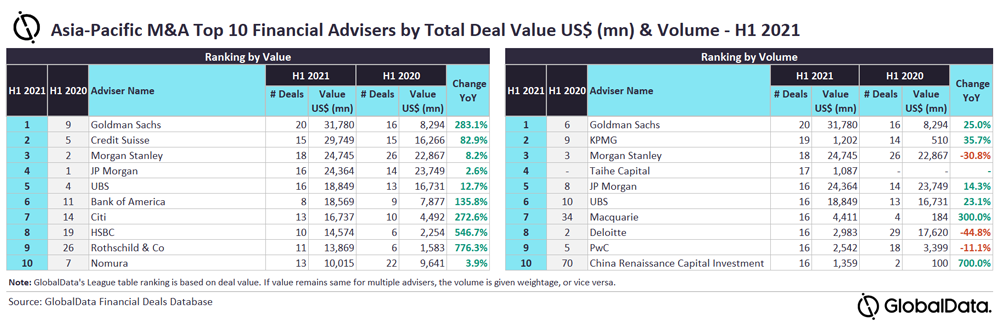 GlobalData, a leading data and analytics company, has revealed its league tables for top 10 financial advisers by value and volume in Asia-Pacific for H1 2021 in its report, ‘Global and Asia-Pacific M&A Report Financial Adviser League Tables H1 2021’.