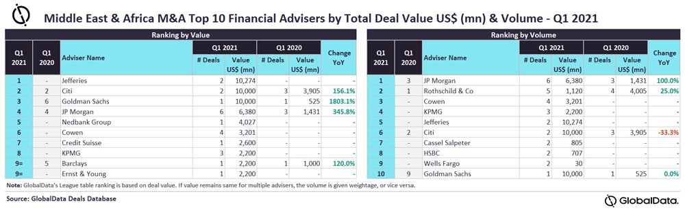Jefferies and JP Morgan were the top mergers and acquisitions (M&A) financial advisers in Middle East & Africa for Q1 2021 by value and volume, respectively.