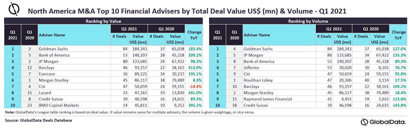 GlobalData, a leading data and analytics company, has revealed its league tables for top 10 financial advisers by value and volume in North America for  Q1 2021 in its report, ‘Global and North America M&A Report Financial Adviser League Tables Q1 2021’.