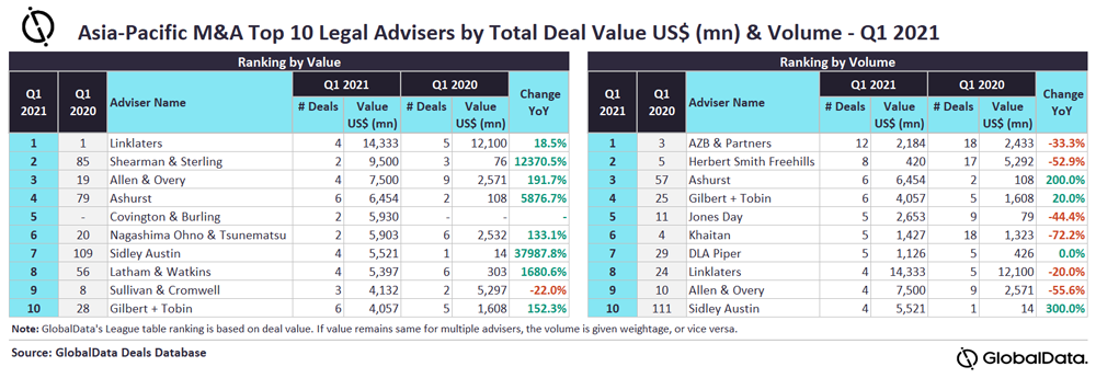 GlobalData, a leading data and analytics company, has revealed its league tables for top 10 legal advisers by value and volume in Asia-Pacific (APAC) region for Q1 2021 in its report, ‘Global and Asia-Pacific M&A Report Legal Adviser League Tables Q1 2021’.