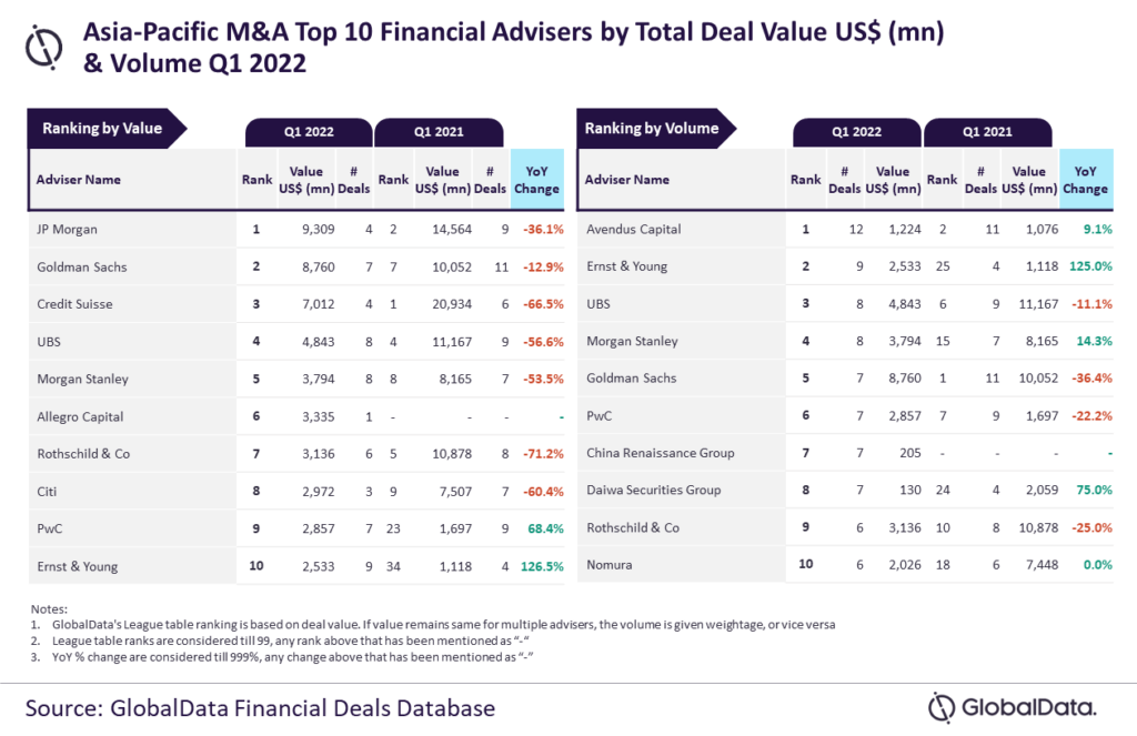 GlobalData, a leading data and analytics company, has revealed its league tables for top 10 legal advisers by value and volume in Asia Pacific for Q1 2022.