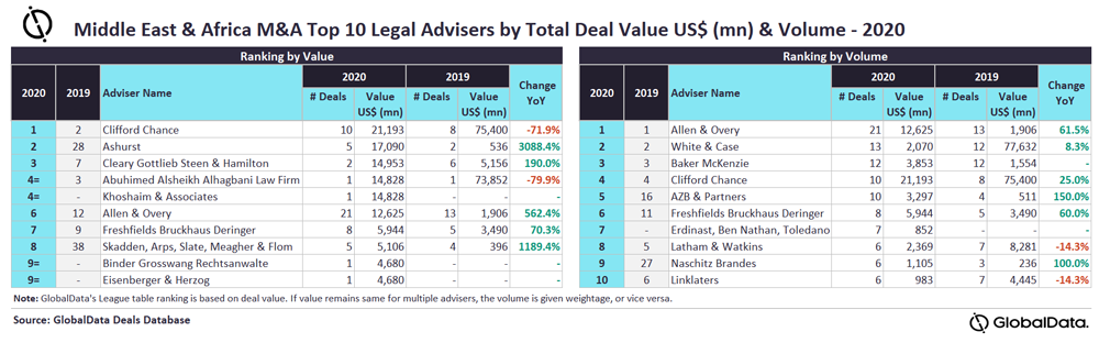 Clifford Chance and Allen & Overy were the top mergers and acquisitions (M&A) legal advisers in the Middle East and Africa (MEA) region for 2020 by value and volume, respectively. Clifford Chance advised on ten deals worth $21.2bn, which was the highest value among all the advisers. Meanwhile, Allen & Overy led in volume terms having advised on 21 deals worth $12.6bn.