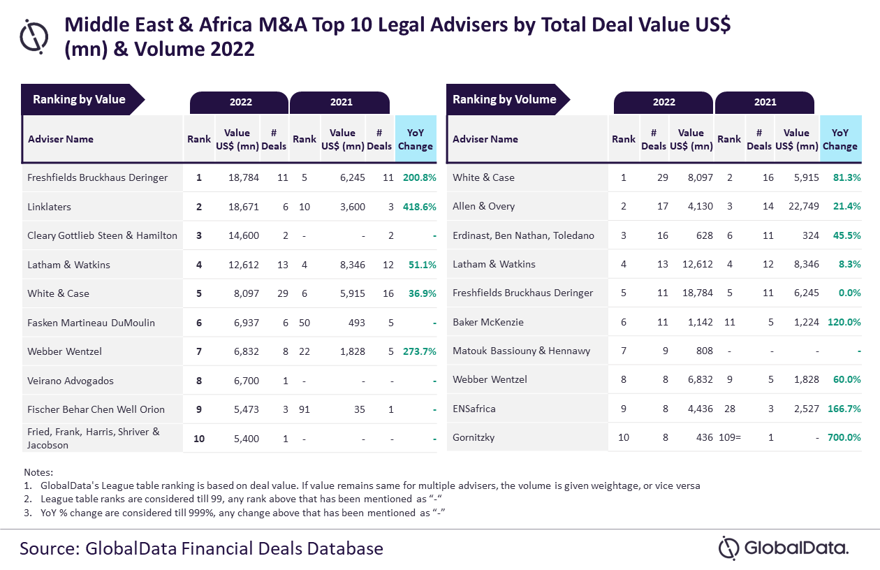 GlobalData, a leading data and analytics company, has revealed its league tables for top ten legal advisers by value and volume in Middle East and Africa for 2022.