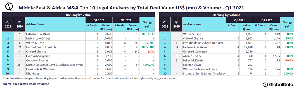 GlobalData, a leading data and analytics company, has revealed its league tables for top 10 financial advisers by value and volume in Middle East & Africa region for Q1 2021 in its report, ‘Global and Middle East & Africa M&A Report Legal Adviser League Tables Q1 2021’.