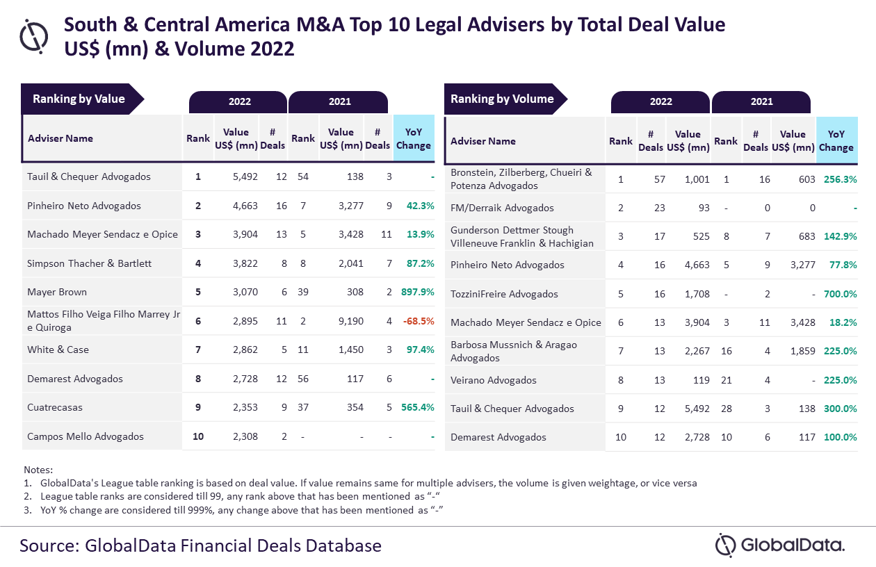 GlobalData, a leading data and analytics company, has revealed its league tables for top ten legal advisers by value and volume in South and Central America for 2022.