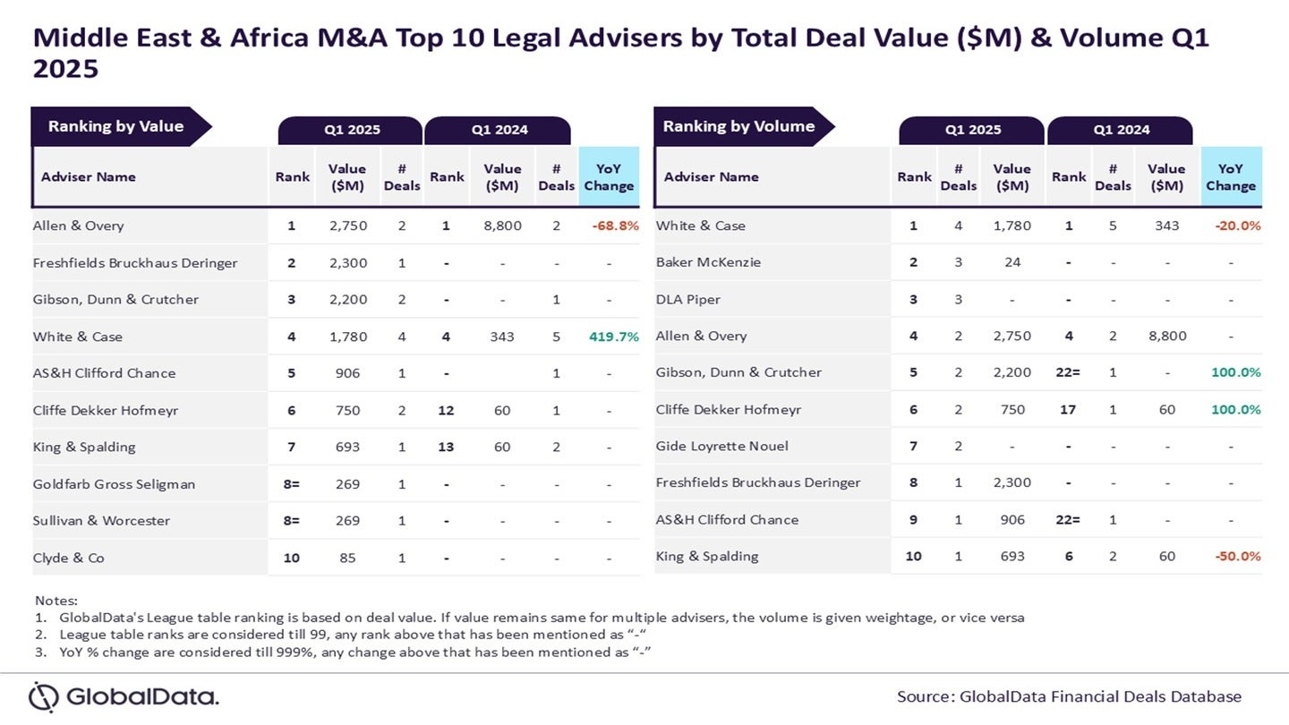 Allen & Overy and White & Case emerged as the leading legal advisers for mergers and acquisitions (M&A) in the Middle East and Africa during the first quarter of 2025, according to the latest league table from GlobalData, a data and analytics provider.