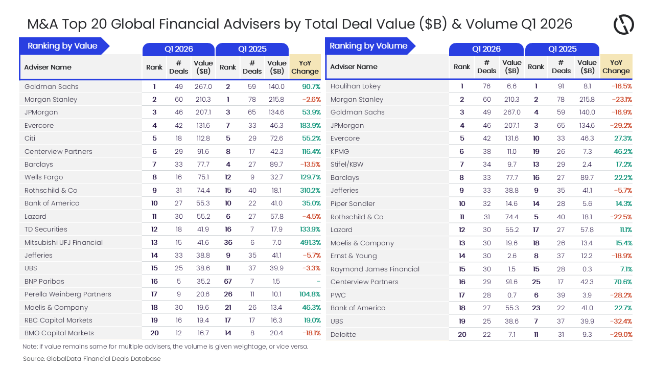 Goldman Sachs ranked first among mergers and acquisitions financial advisers by deal value in the first quarter of 2026, while Houlihan Lokey held the top spot by deal volume, according to GlobalData’s latest Financial Advisers League Table.