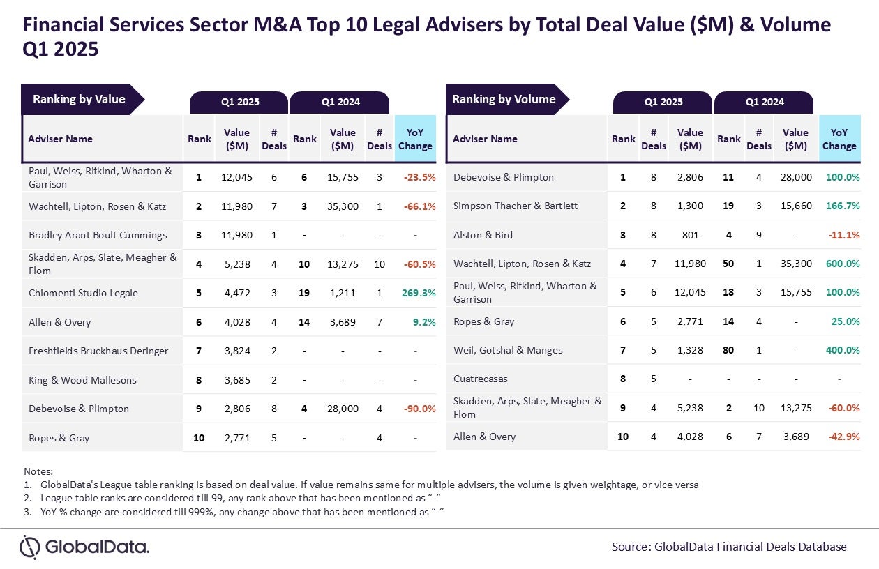 Paul, Weiss, Rifkind, Wharton & Garrison and Debevoise & Plimpton have topped the mergers and acquisitions (M&A) rankings for legal advisers in the financial services sector during the first quarter of 2025, according to GlobalData.