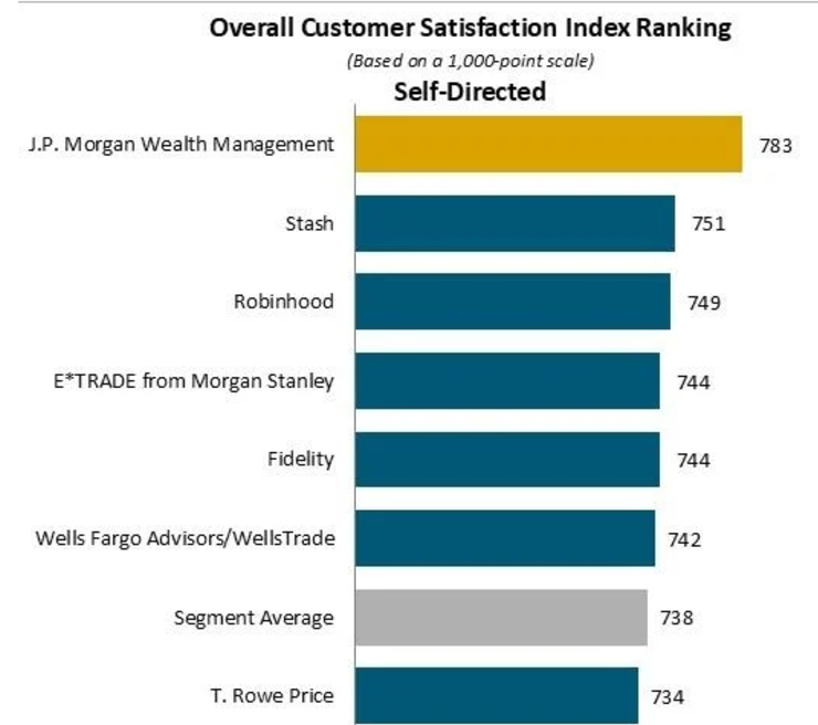 JP Morgan Wealth Management also ranks highest in overall customer satisfaction with the self-directed wealth management digital experience for a second consecutive year, with a score of 783. Stash (751) ranks second and Robinhood (749) ranks third.